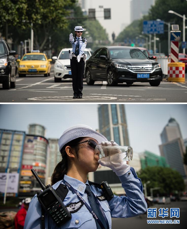 【在能摊鸡蛋的街上执勤】上图:7月15日,柏雪在南京南新街口一处四岔路口执勤;下图:7月15日,柏雪在南京南新街口一处四岔路口执勤休息间隙喝水(拼版照片)。连日来的南京最高气温都在37摄氏度左右。烈日下,柏油马路上有的地方明显已经烤化了;车子停在户外,表面烫得都能煎鸡蛋了。在这种人人唯恐避之不及的暴晒下,92年出生的女交警柏雪从清晨到正午,已经在南京闹市新街口执勤了一整个上午,重复着几乎同样的手势,时不时吹声口哨警示车辆和行人安全,说话时嗓子已经有些沙哑。汗滴从柏雪的脖子、脊梁往下滑落,她也无暇去擦。“不到5分钟又是一身大汗,衣服湿了一遍又一遍,懒得擦了。”柏雪笑称自己已经从交警变成了“焦警”。她所在的南京交警二大队女警中队几乎是清一色的90后女警,10名女警承担着新街口的疏堵保畅任务。 “来往有些民众会跑过来说,‘你们这些小姑娘大热天太辛苦了’。这种理解和配合,让我觉得一切都是值得的。”柏雪说。 新华社记者 李响 摄