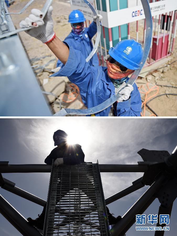 【“每天出的汗能灌几瓶水”】上图:国网宁夏电力公司员工唐亚运(右一)在宁东-浙江±800千伏特高压直流输电工程现场施工(7月16日摄);下图:国网宁夏电力公司员工唐亚运在宁东-浙江±800千伏特高压直流输电工程现场施工(7月16日摄)(拼版照片)。盛夏的大西北戈壁滩,国家电网宁夏电力公司员工唐亚运却要把自己裹得严严实实。 骄阳似火,工作服、安全帽、绝缘手套却一样都不能少。风沙侵袭,头巾和墨镜也必须同时装备齐全。尽管室外温度已达40摄氏度,唐亚运依然每天在野外作业8小时,休息间隙,他一口气喝掉了6瓶水。唐亚运说:“我们每天出的汗接出来都能灌几瓶水了,如果不补充充足的水分,在野外干一小时活就会中暑。” 唐亚运所在的宁东至浙江±800千伏特高压直流输电工程变电站是国家“西电东送”重点工程,是国家确定的大气污染防治行动计划12条重点输电通道之一。新华社记者 王鹏 摄
