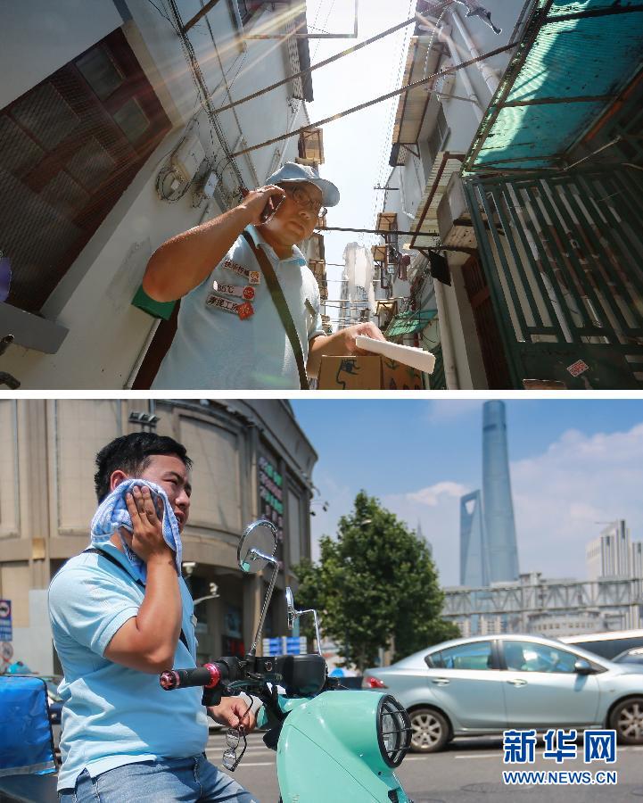 【三伏天里的“急速人生”】上图:7月28日,王自明在联系外卖配送客户;下图:7月28日,由于天气炎热,王自明在配送过程中用毛巾擦汗(拼版照片)。 7月28日,上海发布高温橙色预警信号,外卖配送员王自明早上出门时仔细检查了一下风油精、水壶、毛巾等各种“装备”。他知道,今天又会是忙碌的一天,因为天气热起来之后,冷饮配送量比四五月份翻了一倍。天气越热,王自明的活儿越多,就越要求身手矫捷,对于食品配送员来说,速度才是服务质量的最好体现。刚从骄阳炙烤的室外进入居民楼,王自明的眼睛还没有适应暗下来的光线,就开始两步并作一步跨上楼梯;商务楼内冷气大开,王自明迎着冷气打了个激灵,然后一路小跑,旋风过堂… 从上午9点到晚上8点,王自明靠着电动车和双脚,穿行了13栋商务楼和5个居民区,派送20多单,中间只喝了3次水,中午匆匆忙忙在路边摊买了2个包子充饥。在11个小时的工作时间里,王自明只能把在电动车上骑行当作休息。新华社记者 丁汀 摄