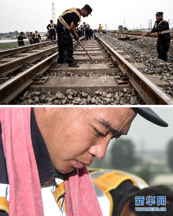 【“热的受不了,帽子里面浇点水顶着”】上图:7月21日,线路工在匀石砟;下图:7月21日,一名线路工在工作中汗如雨下(拼版图片)。能少穿衣服尽量少穿是很多人在夏天的着装选择。但这对34岁的黄亚松来说近乎于奢想:作为沈阳铁路局长春工务段的一名线路工,他要在烈日下穿上厚重的工作服一寸一寸地检查铁路线路,确保暑运安全。趴下身,把脸靠着被太阳晒得烫手的铁轨,仔细地查看几何尺寸,检查线路长平长直,解决螺栓扭力不足,处理道床缺砟,不一会儿黄亚松的脸上就布满了汗水,刚拿毛巾擦了点汗水,又一层汗水滴下来了。实在热得受不了了,黄亚松就往帽子里面浇点水顶着。受厄尔尼诺现象影响,今夏东北地区连续迎来强降雨和高温天气,给铁路运输带来了新的考验,也让长春工务段2000余名线路工人面临着“烤验”。黄亚松说,在4小时“天窗时间”里,自己要喝掉10瓶水,还随身带着抗暑和急救的药品。“你要说不累,那就是瞎说,累指定是累,但是我们的工作就是这样,就是要打得起硬仗,战得了酷暑。” 新华社记者 王昊飞 摄