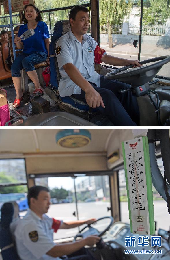 【盛夏“烤火”的人】上图:在温度高达43℃的车厢里,乘客在扇扇子降温,驾驶员陈林(右)的手始终不离方向盘和档位(7月27日摄);下图:驾驶员陈林在高温下运送乘客(7月27日摄)(拼版照片)。高温天发动机的机器盖子很烫,可别轻易摸;驾驶舱温度肯定超40摄氏度了;衣服和裤子湿透是正常的,喝水不能停……这些都是重庆691路普通公交车驾驶员陈林的经验之谈。 7月27日,重庆最高气温超过37摄氏度,43岁的驾驶员陈林像往常一样,坐在43摄氏度的驾驶室里,紧挨司机座位的发动机散发着热量,像个持续发热的大火炉。 今年夏天,已是陈林师傅与“大火炉”朝夕相伴的第九个夏天了。堵车在温度40多度的车厢里,乘客扇扇子降温,但是驾驶员陈林的手始终不离方向盘和档位。据悉,重庆691路普通公交车已在8月初更换为中级空调车。 新华社记者 陈诚 摄