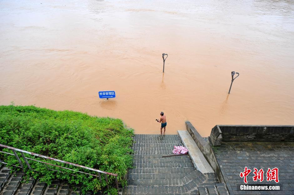 广西连日降雨邕江水位猛涨 江边景观道被淹没