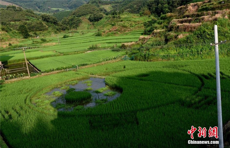 8月3日,在广西三江侗族自治县古宜镇马坪村马坪屯,一块稻田呈现出“八卦图”形状。该图形由当地一潜心研究八卦知识的农民于春天播种时设计而成,使稻田变成天然的“绿色课本”。龚普康 摄