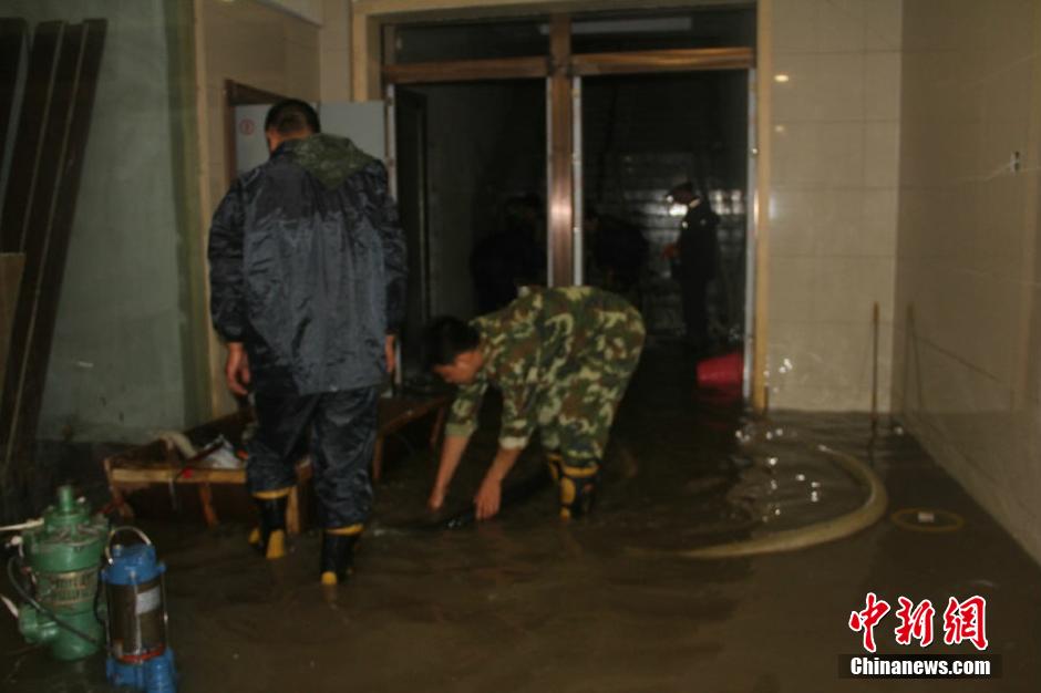 工作人员正忙着将超市内的水抽出。很多商场、超市以及商铺内一片“汪洋”,许多货物泡在水中,部分商铺积水深约15厘米。 中新社发 郑兵 摄