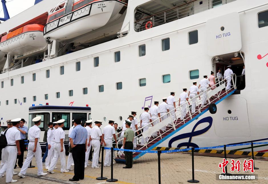 图为近300名官兵登上停靠在烟台一码头的“中华泰山”号邮轮参观。 王娇妮 摄