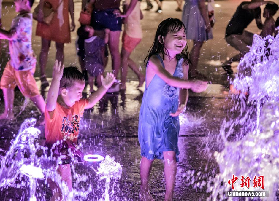 图为在音乐喷泉内玩耍的福州小朋友。 中新社发 杨婀娜 摄