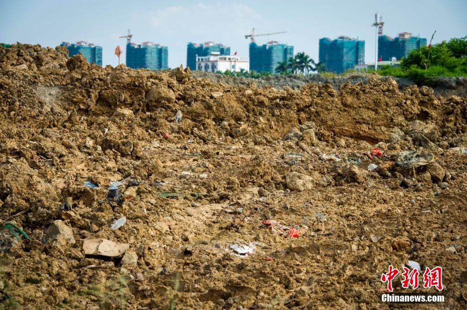 图为从澄迈县富力红树湾项目沿一条土路行驶,道路两旁都是被处理过的土地,坑洼不平的路面仍可看到各种建筑、生活垃圾与泥土搅拌在一起。中新社发 骆云飞 摄