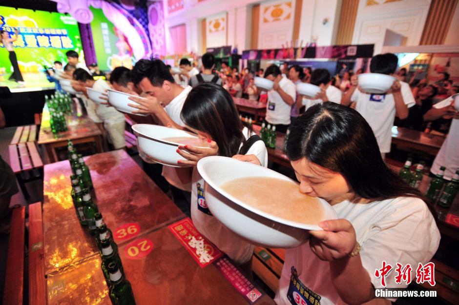 8月9日晚,百名参赛者在武汉欢乐谷用脸盆豪饮啤酒,争当“啤酒王”。不仅有勇夫在场,更有美女上阵。一位壮汉以2分钟的惊人时间喝完一盆啤酒,堪称“海量啤酒肚”。本次“啤酒王挑战赛”为团队赛,两对阵营同台竞技,5分钟之内剩余啤酒最少的队伍获得最终胜利。钟欣 摄