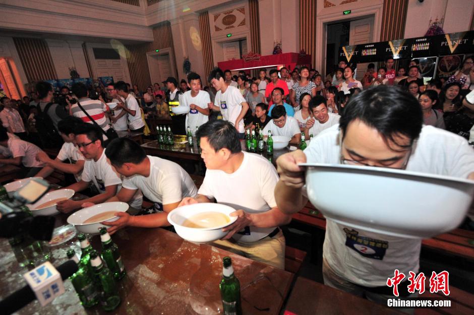 8月9日晚,百名参赛者在武汉欢乐谷用脸盆豪饮啤酒,争当“啤酒王”。钟欣 摄