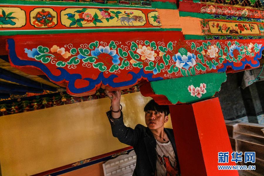 在西藏拉萨八廓街,一名画师在洛桑扎西的“吉日卓康”古宅酒店房梁上绘画(8月5日摄)。 新华社记者 郑焕松 摄