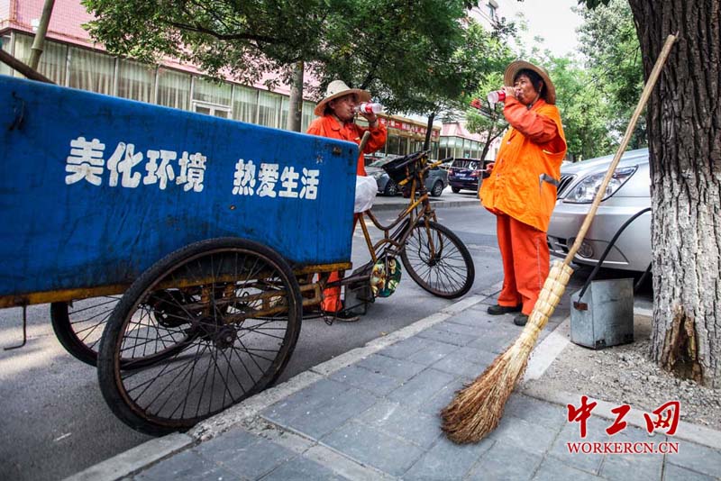 据田大姐介绍,“有时实在是太累了,就在路边喝一口水,简单休息一下”,然后又继续开始清扫工作。(中工网记者 张起晨 摄)