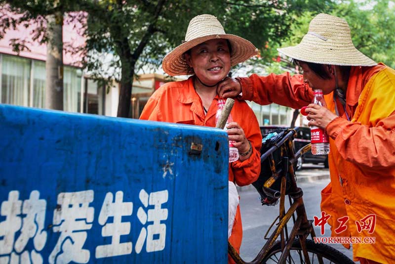 田大姐佘大姐是同事,因为两人有一段共同负责的街道,田大姐有时会和佘大姐在工作中遇到。佘大姐笑着说,“也没有说 谁必须打扫,我们俩谁先干完自己的活谁就先来打扫这条街道。”(中工网记者 张起晨 摄)