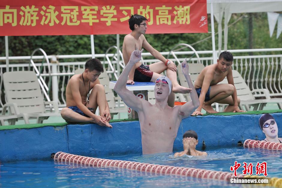 游泳池挂起孙杨、宁泽涛等中国游泳队运动员的照片。 陈超 摄
