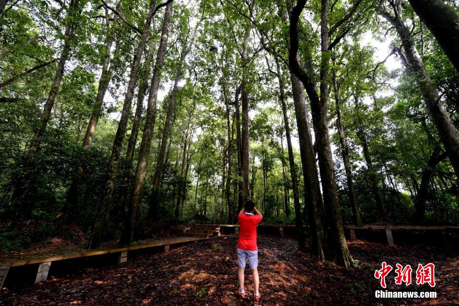 8月12日,游客在福建建阳麻沙镇水南村参观千年楠木林群。该片树林被称为水南村的“风水林”,由近万棵大小不等的珍稀楠木构成。林内枝繁叶茂,四季常绿,是国家级重点生态林保护区。相传楠木林为宋代理学世家“蔡氏九儒”中的蔡元定首栽,繁衍保护至今已有一千多年的历史。近年来,先后有《碧血剑》、《鹿鼎记》、《西游记》、《画皮2》等多部影视剧剧组把这里作为外景地拍摄。图为游客参观楠木林。 王东明 摄
