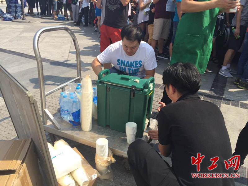8月13日,天津开设了八个献血点,一上午血库全部爆满。在天津火车站,前来献血的市民在烈日下要排队3个小时以上,却依然热情饱满。附近商铺拿出了遮阳伞和冰饮大桶,主动免费送到排队市民手中。负责量血压的大夫下午2点还没顾上吃午饭,他总说“再等一会儿”。下午赶过来的市民被告知只能明后天再来了,因为队伍实在太长了,一上午就有5000群众前来献血。中工网记者 秦笑语摄