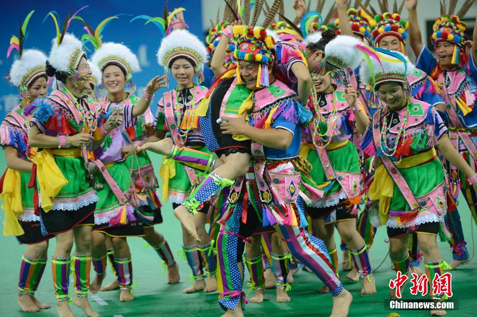 8月13日,第十届少数民族运动会的表演项目上演,少数民族身着各自的传统服装,表演了包括高山族的抛陀螺、蒙古族的哈日靶、雷山苗族铜鼓舞等多民族代表性项目,引得观众声声喝彩。图为高山族表演抛陀螺。 刘文华 摄