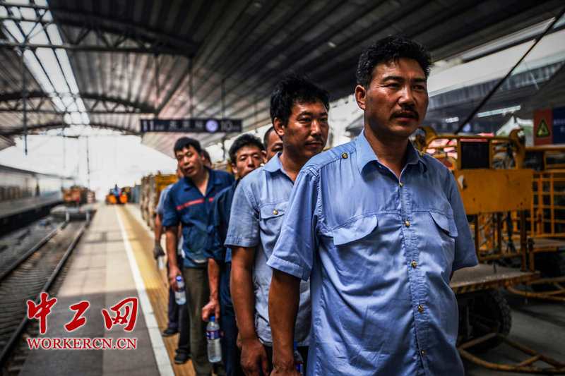 “快看!列车马上进站了。”王春城一边招呼着一边带领其他8名兄弟早早的在北京站的站台上等候着列车的到来!(中工网记者 张起晨 摄)