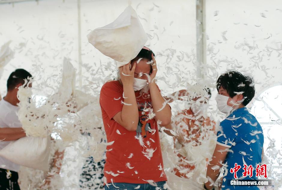 8月15日,一场"枕头大战"在南京门东老街头上演,吸引了大批年轻人前来使用具有安全保障的棉絮枕头相互追打。 中新社发 泱波 摄