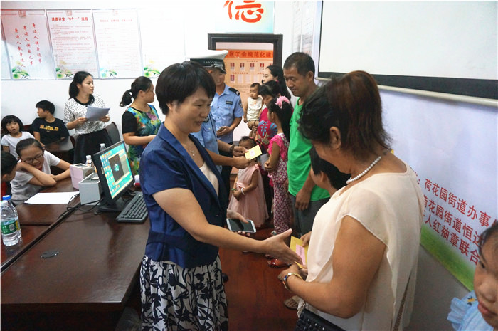 街道、社区领导将助学金交到经济困难的农民工手中。