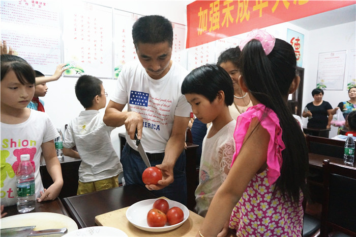 社区活动室“变身”小厨房,孩子们各展厨艺。如何用刀来加工西红柿,呈现生动造型?社区农民工代表魏成粮有诀窍。