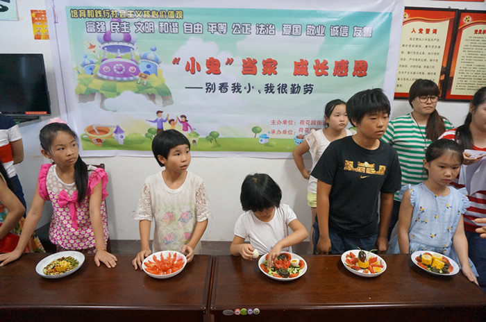 都说穷人家的孩子早当家,农民工兄弟的子女也是很懂事的。活动现场,社区工作人员为孩子们开辟了三个互动区,分别组织孩子亲手做饭菜、削水果、叠衣服。当孩子们将精心烹饪的食物夹到父母、爷爷奶奶等长辈口中时,很多长辈都开心地笑了。