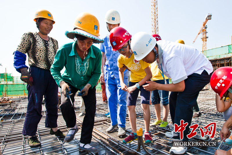 当日下午,17个农民工家庭的留守儿童来到中建二局一公司石景山项目工地,在农民工督察队员的带领下,和父母一起在烈日下学绑钢筋,体验父母工作的艰辛。一个妈妈在镜头前激动地:“今天我的儿子更懂事了。为了我的儿子,我一定要注意安全!” 中工网记者 李雪峰 摄