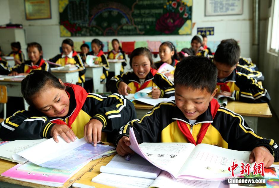 拿到新课本孩子们很高兴,并在课本上写上名字。