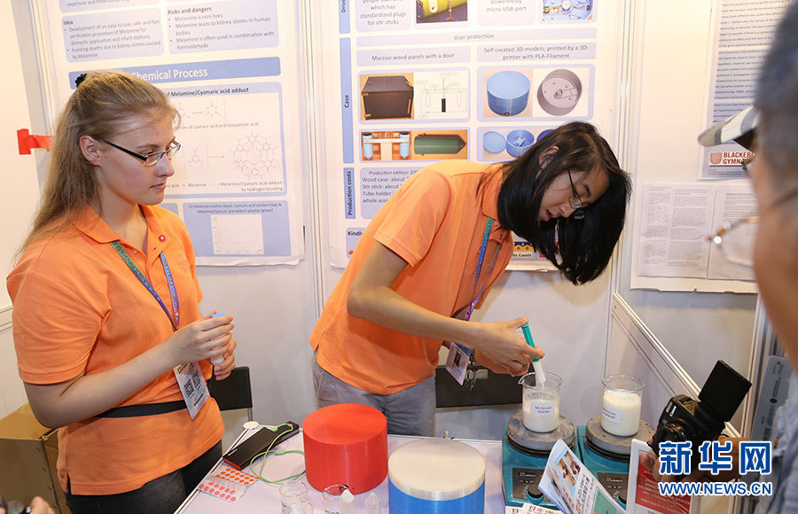 8月20日,由中国科学技术协会和香港特区政府共同主办的第30届全国青少年科技创新大赛在香港拉开帷幕。图为大赛选手向参观者演示实验过程。新华网 翟子赫 摄