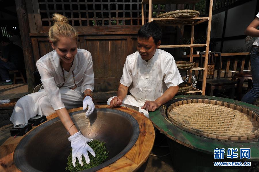 8月23日,来自德国的欧洲熊猫粉丝在峨眉山有机茶原料种植基地体验绿茶制作技艺。当日,“行南丝绸之路·游大熊猫故乡”的12名欧洲熊猫粉丝团成员来到四川省峨眉山市,品尝绿茶,聆听茶文化继承人讲述中国茶的文化背景、历史发展、制作工艺,并来到峨眉山有机茶原料种植基地体验采茶制茶过程,了解中国茶文化。新华社记者 江宏景 摄