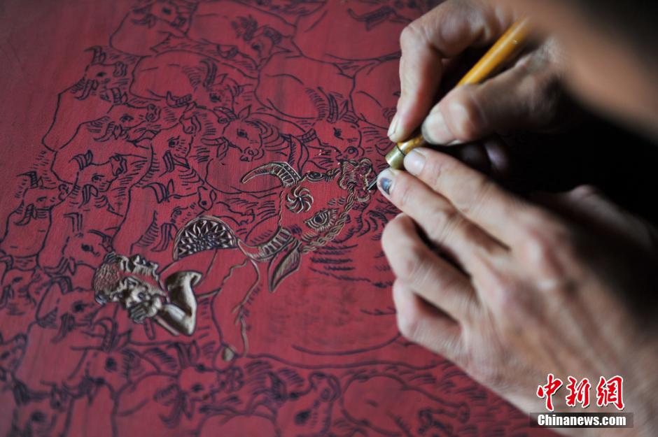 图为阿峨新寨壮族农民龙子辉在木板上雕刻画作,雕刻出的人物和动物形象活灵活现。 中新社发 任东 摄