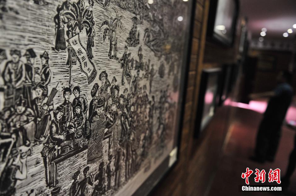阿峨新寨展出的版画,内容诉说着壮族的传统习俗。 中新社发 任东 摄