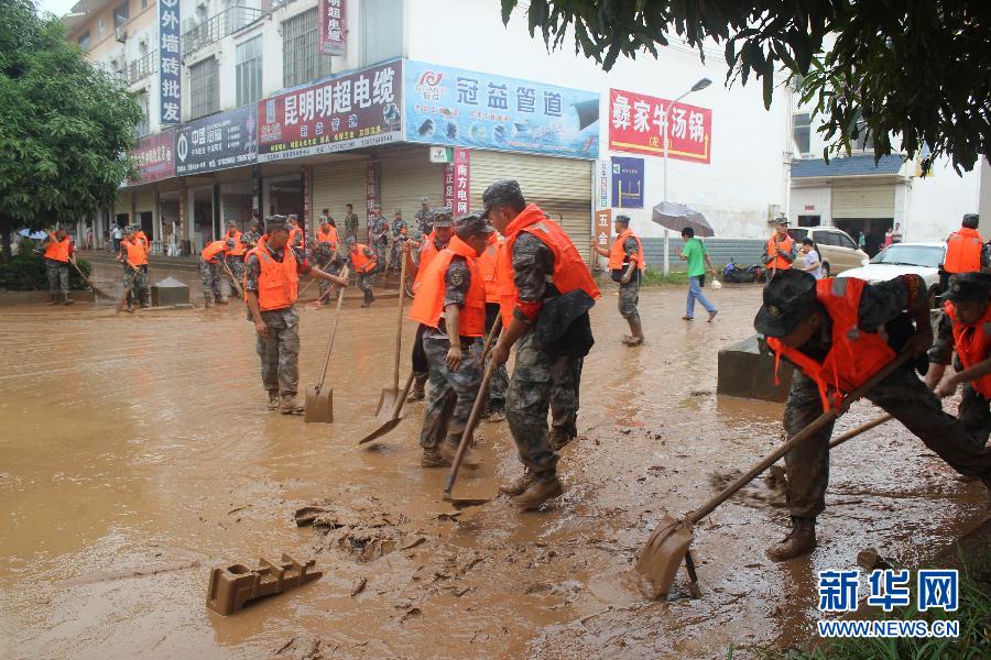 8月26日,部队官兵在富宁县城中清理洪水过后的街道淤泥。