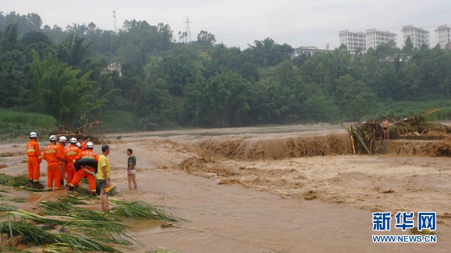 8月26日,在云南富宁归朝镇,消防救援人员在商讨营救被洪水困住的群众(右)。新华社发(向玮 摄)