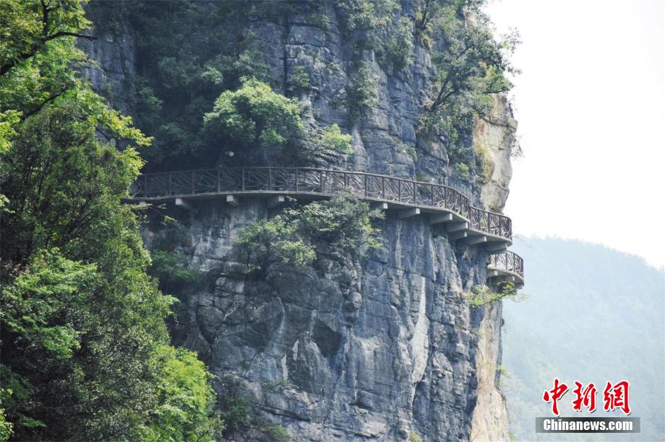 8月26日,湖北恩施石门河景区,游客行走在栈道上。 马芙蓉 摄