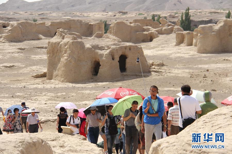 8月26日,游客在游览吐鲁番重要景点交河故城遗址。进入8月,新疆吐鲁番各大景区游客激增,游客数量较去年同期大幅增加。 新华社发(徐丽 摄)
