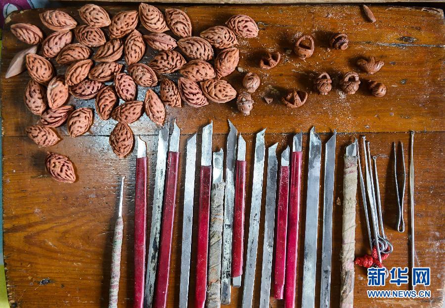 这是民间艺人胡银松收集的桃核和他自己加工的雕刻工具(8月26日摄)。 66岁的胡银松是浙江省桐乡市土生土长的核雕艺术家。桐乡当地有给孩子佩戴桃核挂件的传统习俗。10多岁受叔祖父影响,胡银松喜欢上核雕。50年来,胡银松靠着自己的反复琢磨和摸索进行核雕创作。迄今为止,他雕刻了上千件竹篮、木船、小壶、鞋子等带有江南生活气息的核雕艺术作品。经过数十年的坚持,胡银松的桃核雕刻已经成为浙江嘉兴的市级非物质文化遗产,他经常给喜爱这项技艺的年轻人传授经验,推广核雕技艺。新华社记者 徐昱 摄