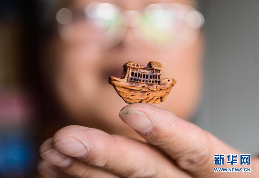 8月26日,胡银松展示桃核雕刻而成的小木船。 66岁的胡银松是浙江省桐乡市土生土长的核雕艺术家。桐乡当地有给孩子佩戴桃核挂件的传统习俗。10多岁受叔祖父影响,胡银松喜欢上核雕。50年来,胡银松靠着自己的反复琢磨和摸索进行核雕创作。迄今为止,他雕刻了上千件竹篮、木船、小壶、鞋子等带有江南生活气息的核雕艺术作品。经过数十年的坚持,胡银松的桃核雕刻已经成为浙江嘉兴的市级非物质文化遗产,他经常给喜爱这项技艺的年轻人传授经验,推广核雕技艺。新华社记者 徐昱 摄