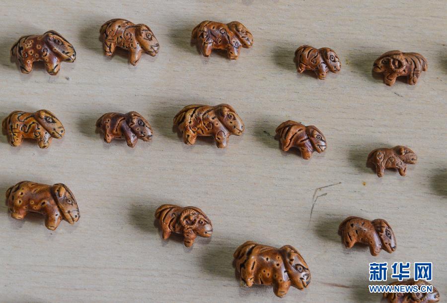 这是胡银松为农历羊年雕刻的一群核雕羊(8月26日摄)。 66岁的胡银松是浙江省桐乡市土生土长的核雕艺术家。桐乡当地有给孩子佩戴桃核挂件的传统习俗。10多岁受叔祖父影响,胡银松喜欢上核雕。50年来,胡银松靠着自己的反复琢磨和摸索进行核雕创作。迄今为止,他雕刻了上千件竹篮、木船、小壶、鞋子等带有江南生活气息的核雕艺术作品。经过数十年的坚持,胡银松的桃核雕刻已经成为浙江嘉兴的市级非物质文化遗产,他经常给喜爱这项技艺的年轻人传授经验,推广核雕技艺。新华社记者 徐昱 摄