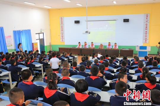 8月27日,在新疆博湖县第一小学阶梯教室,95岁的中国远征军老兵牛维刚在进行《勿忘国耻 圆梦中华》纪念抗日战争胜利70周年主题宣讲。学生们认真投入地听着老人讲述当年的战火青春和坎坷经历。 年磊 摄