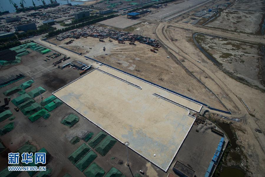 这是8月27日拍摄的防渗池。日前,一个占地总面积约2万平方米的防渗池在距离天津港爆炸事故核心区约4公里处的天津港海铁一号路建成,用于存放从事故现场清理出的污染土。防渗池由中铁十八局集团承建,池内铺有用2层防渗膜和3层土工布构成的防渗层,池底的防渗层上方还覆盖有约5厘米厚的沙子和8厘米厚的连锁砖。防渗池即将投用。新华社记者 郭昱 摄 图片来源:新华网