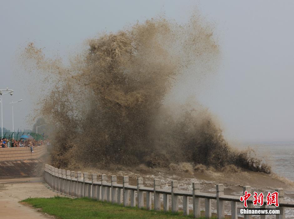 8月30日,浙江海宁,滚滚秋季潮汛袭来,在沿江观潮的游客欣赏到壮观的钱江大潮。 中新社发 张祥荣 摄