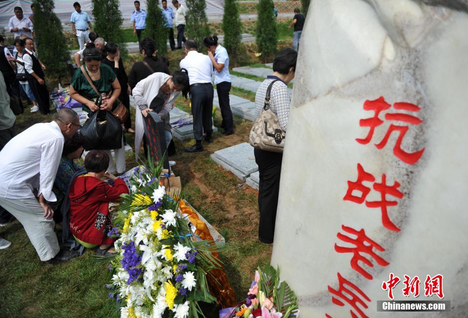 8月31日,位于河北省元氏县的神岩山公墓,工作人员正免费为首批12名抗战老兵完成安葬仪式。据了解,为纪念中国人民抗战胜利暨世界反法西斯战争胜利70周年,神岩山公墓特别设立了“抗战老兵墓区”,并免费提供100个墓位无偿捐献给抗战老兵,让他们能入土为安。墓碑上刻有老兵及其配偶姓氏、生卒时间、部队番号及主要抗战事迹。图为抗战老兵的家属、朋友来到墓碑前祭奠。 中新社发 翟羽佳 摄