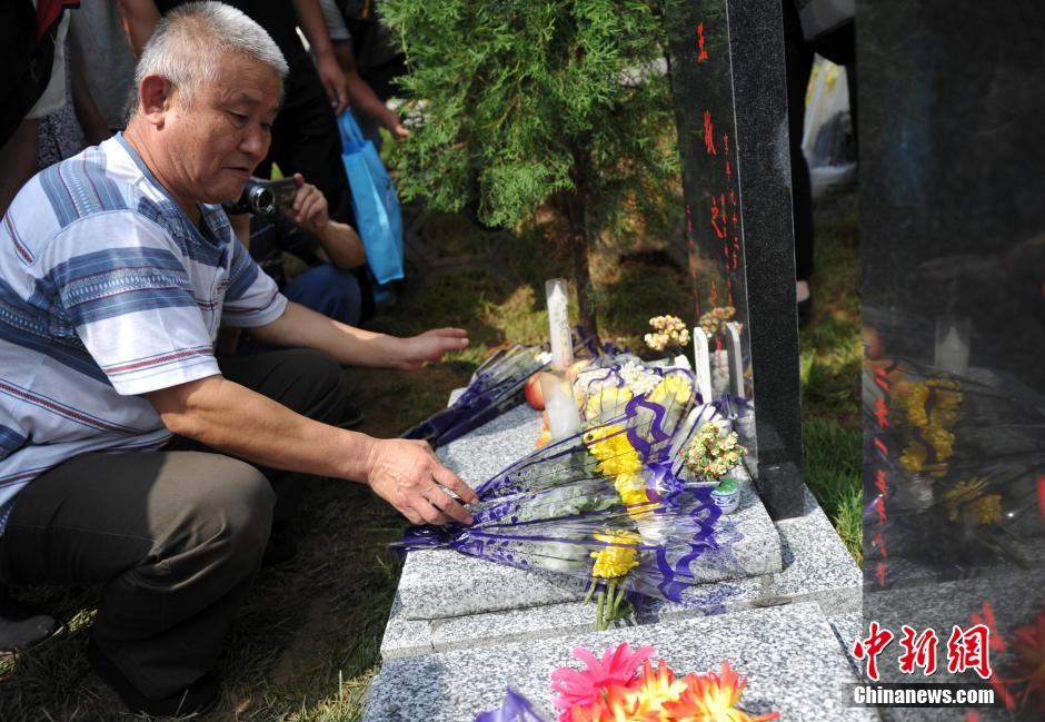 8月31日,位于河北省元氏县的神岩山公墓,工作人员正免费为首批12名抗战老兵完成安葬仪式。据了解,为纪念中国人民抗战胜利暨世界反法西斯战争胜利70周年,神岩山公墓特别设立了“抗战老兵墓区”,并免费提供100个墓位无偿捐献给抗战老兵,让他们能入土为安。墓碑上刻有老兵及其配偶姓氏、生卒时间、部队番号及主要抗战事迹。图为抗战老兵家属、朋友来到墓碑前祭奠。