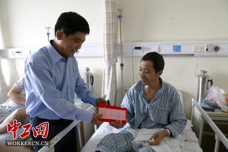 中建二局北京分公司党委副书记、纪委书记、工会主席杨春亭看望受伤工友,将爱心善款交到工友手中