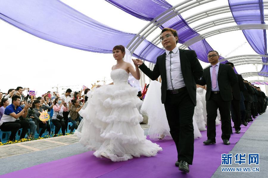 9月2日,在金昌市紫金花城景区,新人牵手走进婚礼现场。当日,46对来自全国各地的新人和6对金银婚夫妇共同在甘肃省金昌市紫金花城景区参加“薰衣草之约”集体婚礼。 新华社记者 范培珅 摄