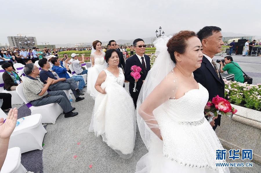 9月2日,在金昌市紫金花城景区,金银婚夫妇携手走向集体婚礼现场。当日,46对来自全国各地的新人和6对金银婚夫妇共同在甘肃省金昌市紫金花城景区参加“薰衣草之约”集体婚礼。 新华社记者 范培珅 摄