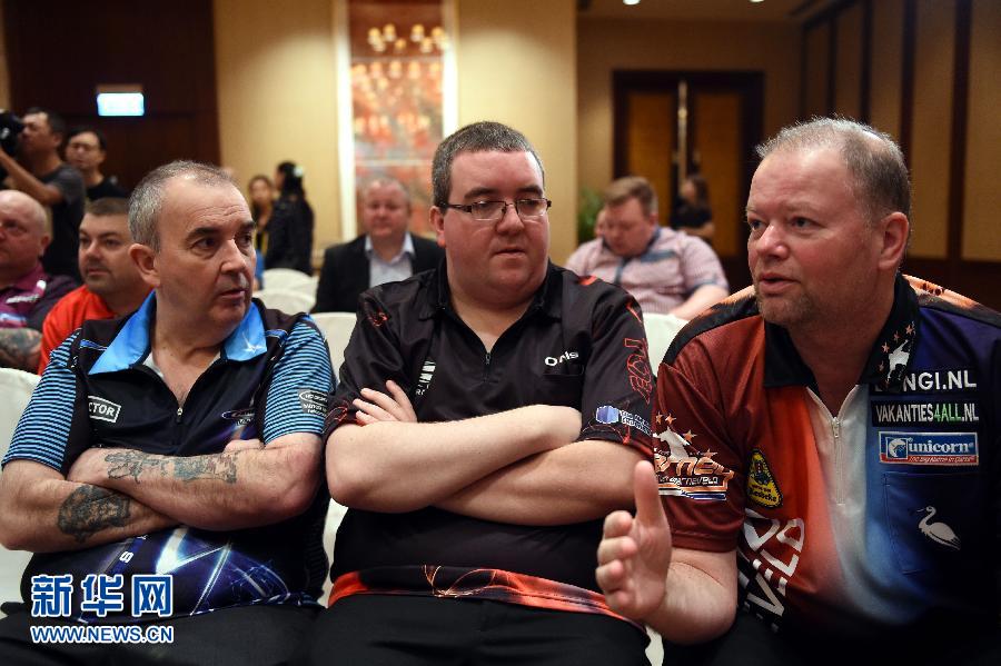 9月2日,英格兰选手菲尔·泰勒(前左)及队友斯蒂芬·邦廷(前中)和荷兰选手雷蒙德·范·巴訥费尔德在新闻发布会上交谈。当日,香港飞镖大师赛新闻发布会暨抽签仪式在香港港丽酒店举行,8名世界级选手将于9月4日至5日在香港中环海滨户外帐篷场馆进行激烈争夺。新华社记者卢炳辉摄