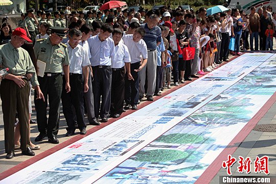 9月2日,在河北石家庄人民广场,由近百幅抗战纪念照组成的“70米抗战长卷”一亮相,便吸引了众人的眼球。中新社发 翟羽佳 摄