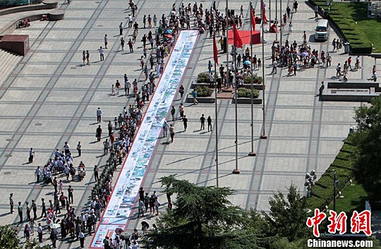 9月2日,在河北石家庄人民广场,由近百幅抗战纪念照组成的“70米抗战长卷”一亮相,便吸引了众人的眼球。中新社发 翟羽佳 摄