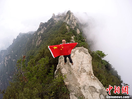 9月3日,中国人民抗日战争暨世界反法西斯战争胜利70周年纪念日,河南洛阳老君山,一名男子登上老君山3000米绝壁悬崖,展出五星红旗。中新社发 王中举 摄